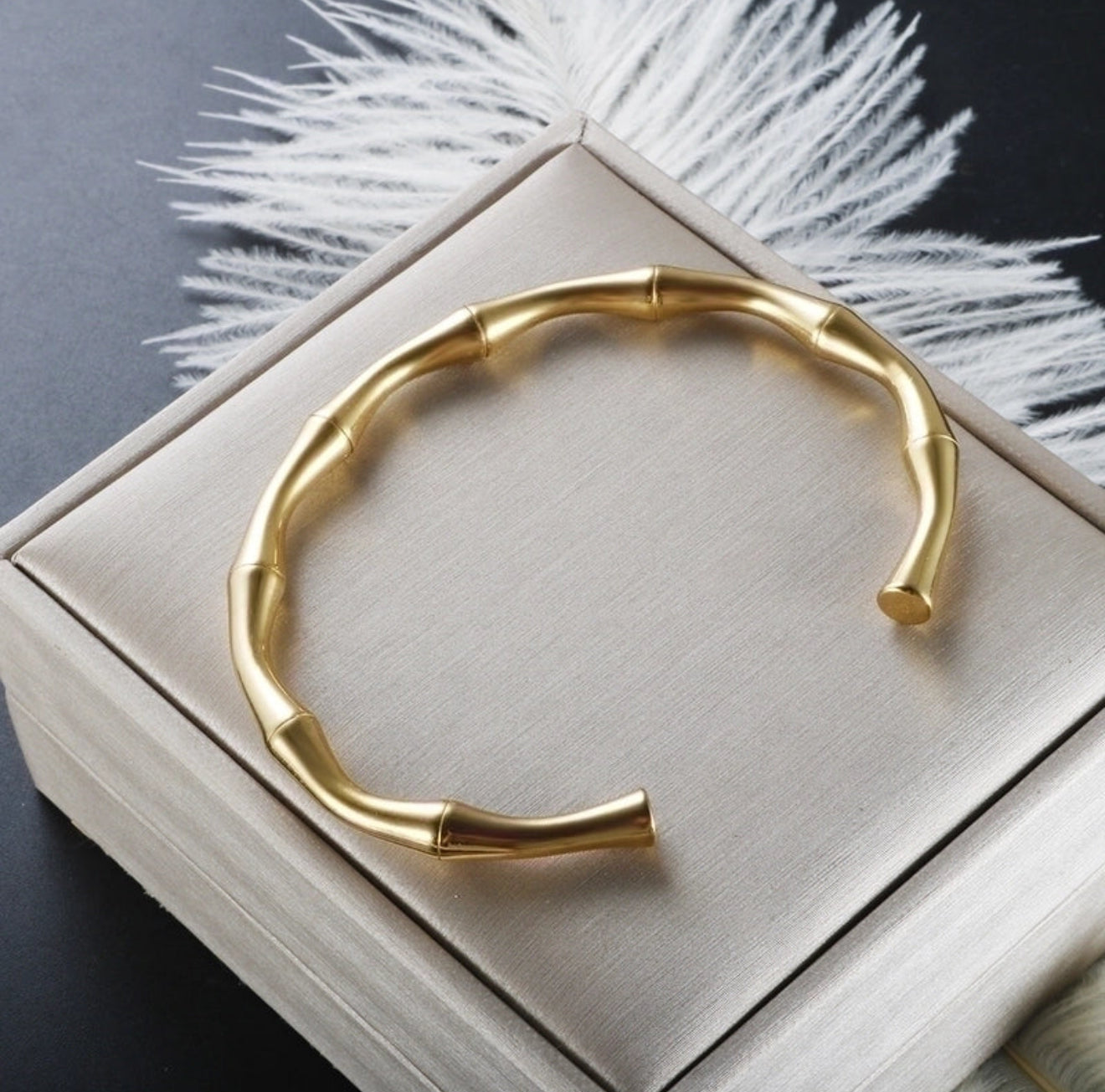The Cleo Bangle delivers effortless strength and shine. Its wide, seamless silhouette wraps your wrist in minimal elegance — perfect for styling solo or stacking with textured pieces. Made with durable titanium steel and plated in rich 18k gold, Cleo is water-resistant, tarnish-resistant, and endlessly wearable.
