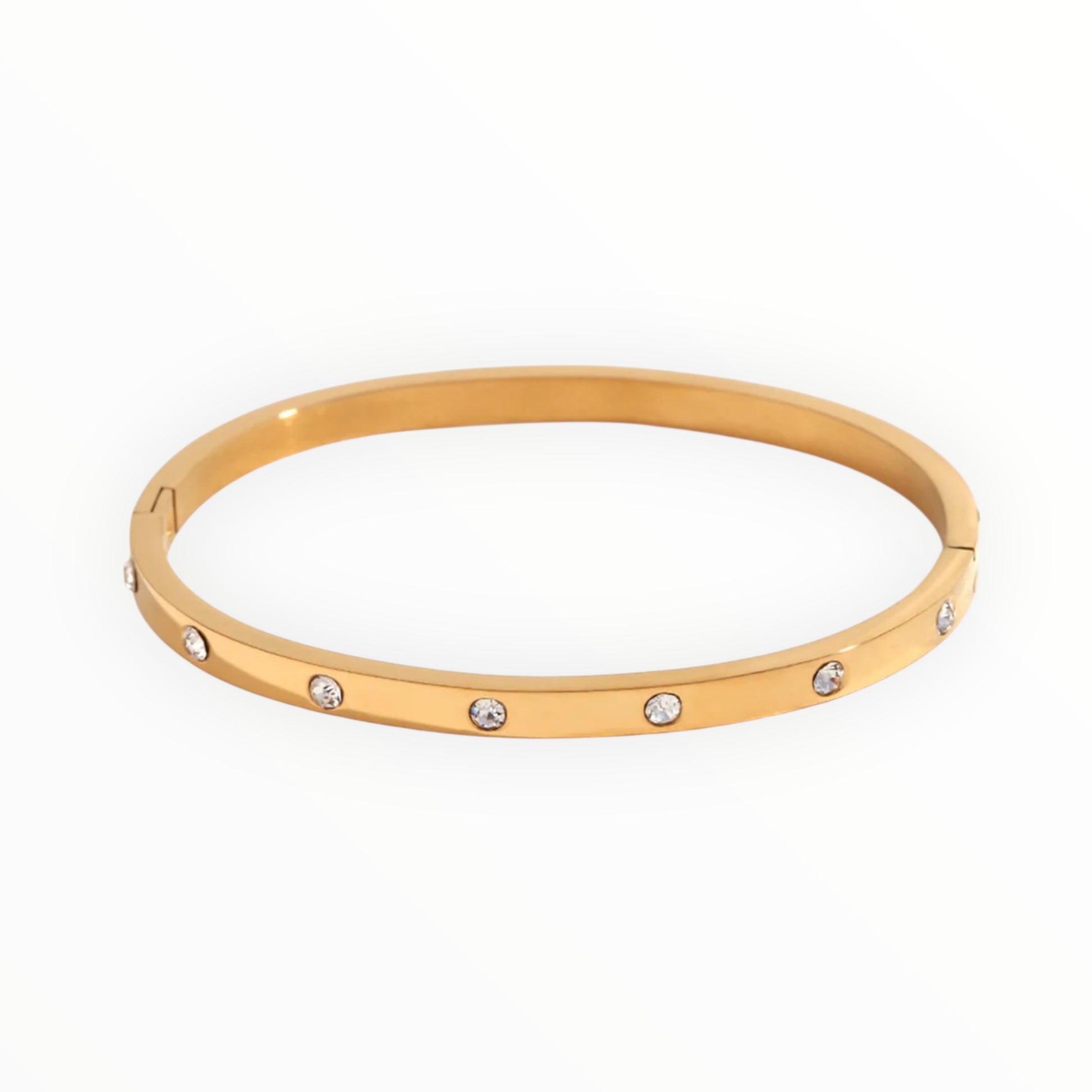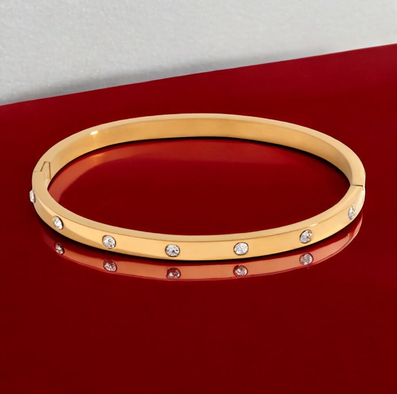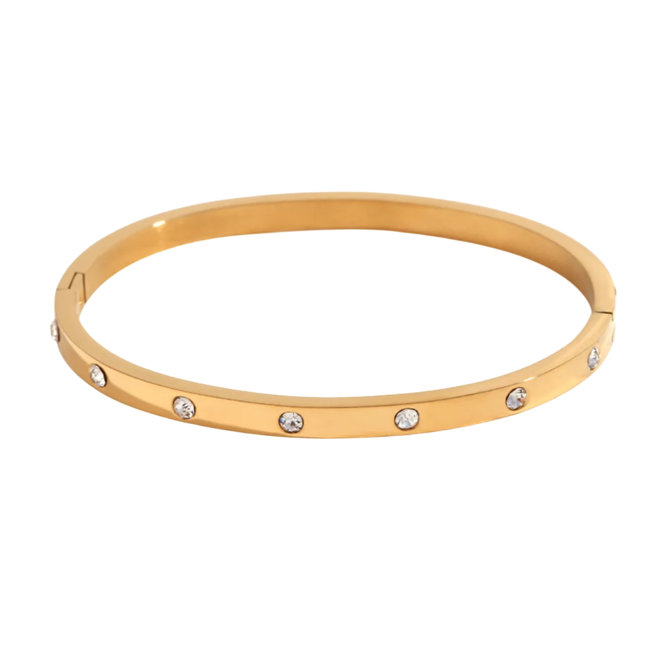 A classic round bangle in 18k gold-plated stainless steel — sleek, stackable, and endlessly versatile.