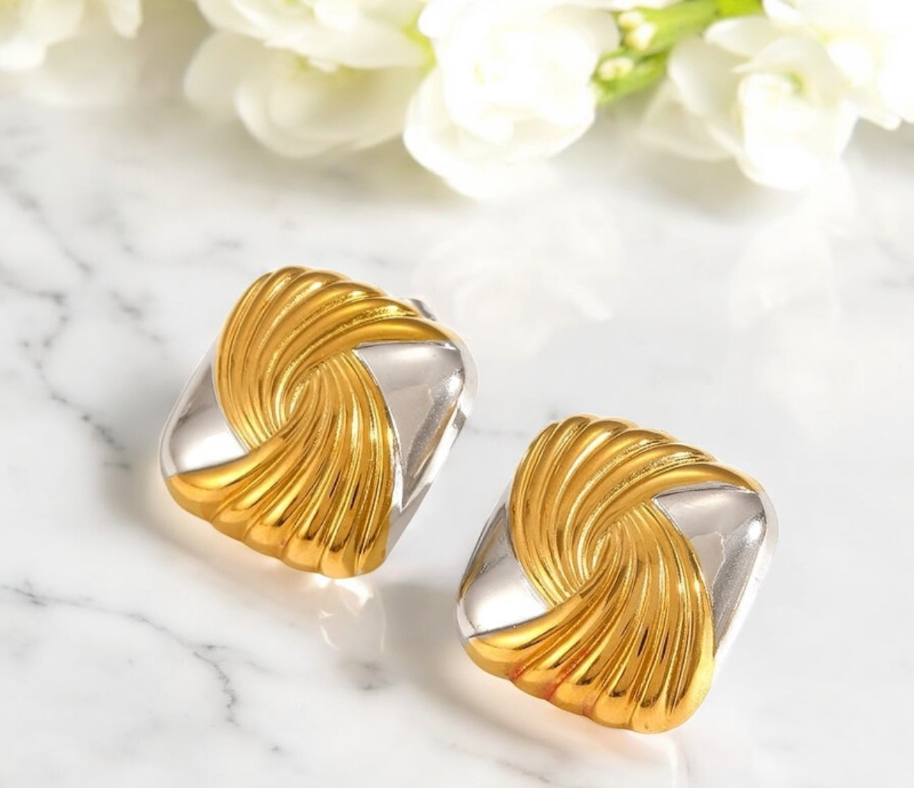 Striking two-tone studs in silver and gold — modern geometry meets bold contrast.