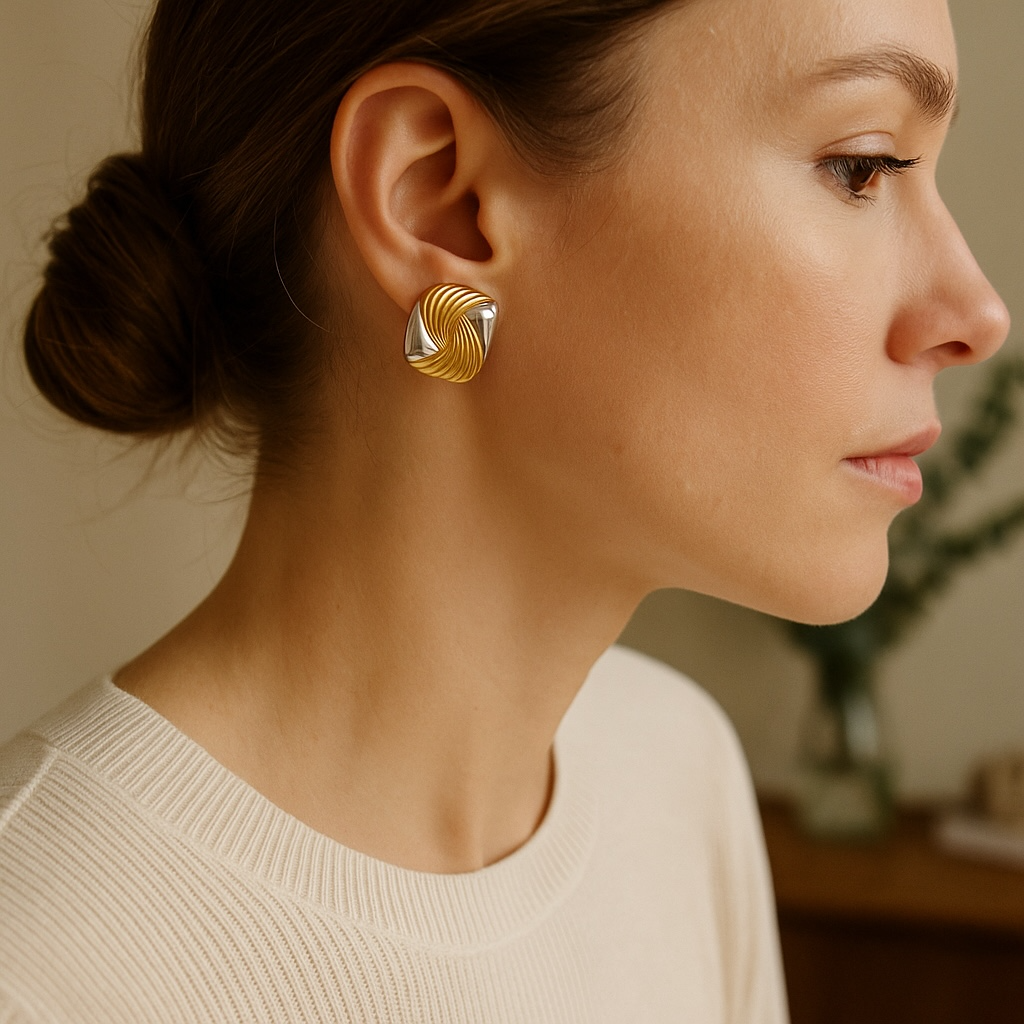 The Arden Earrings are designed for those who love structure with a twist. Featuring a sculptural, asymmetric shape in a half-gold, half-silver finish, these stainless steel studs add instant edge to your look. They're lightweight, tarnish-resistant, and finished with clean lines for a modern, polished vibe.