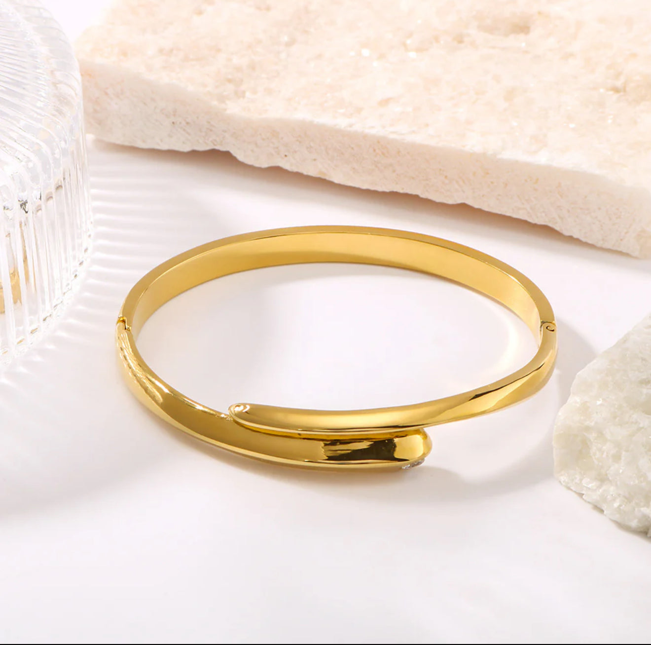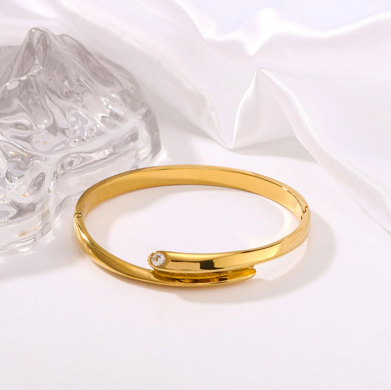 The Sorella Bangle is a celebration of contrast: bold structure softened by delicate diamond-inlay details. Its asymmetrical shape wraps the wrist with confidence, while shimmering cubic zirconia stones catch the light in all the right places.