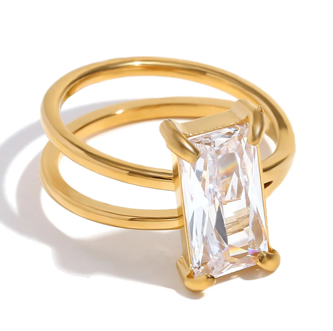 The Veda Ring makes geometry feel elevated. With its striking mix of shapes and smooth gold finish, this piece is a sculptural standout. Crafted from electroplated stainless steel and plated in 18k gold, it’s lightweight, durable, and tarnish-resistant — made to turn heads without overpowering your look.