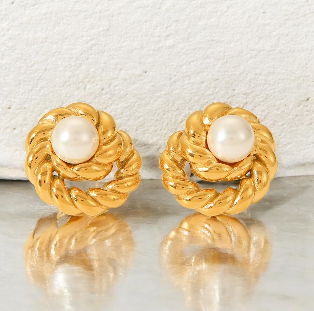 Modern pearl elegance — sculptural 18k gold-plated studs with soft faux pearl centers.