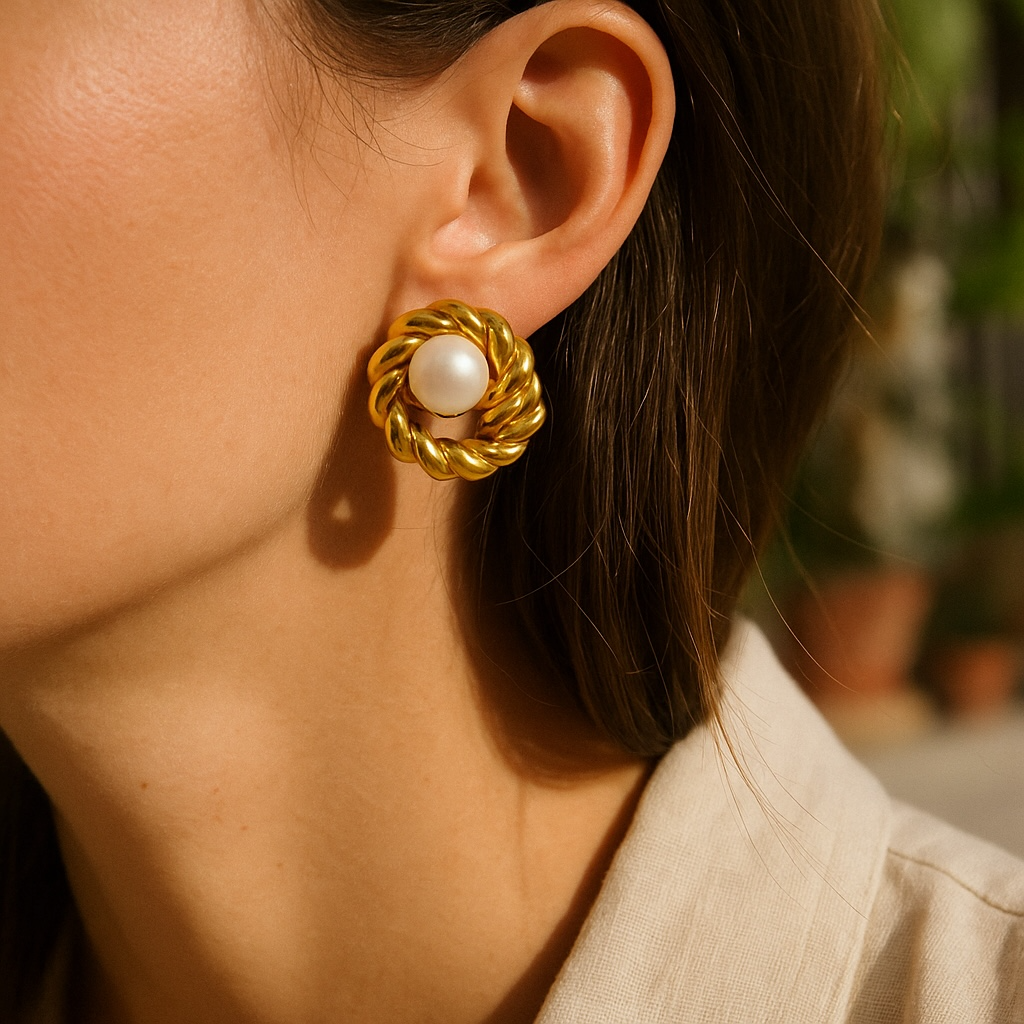 The Nahla Studs bring a timeless element into a clean, minimalist design. With their rounded gold-plated frame and luminous faux pearl at the center, they add a soft glow to any look. Made from 304 stainless steel and finished in rich 18k gold plating, they’re lightweight, tarnish-resistant, and comfortable enough for all-day wear.